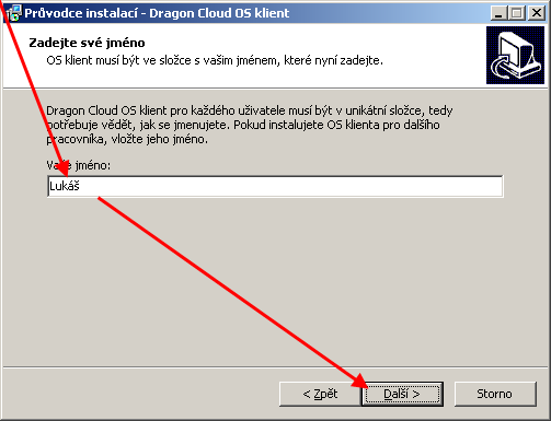 Používá-li počítač více pracovníků, například se střídají na směnách, musí být pro každého uživatele nainstalována separátní instance aplikace OS klient. Proto zde musíte zadat své jméno, a instalační program tak vytvoří vaši vlastní instanci aplikace včetně ikonky na ploše. Toto jméno zadejte i v případě, že na počítači budete používat aplikaci OS klient jenom vy, není dovoleno nechat zde prázdné pole. V případě, že chcete nainstalovat další instanci pro pracovníka, se kterým se na počítači střídáte, proveďte instaci dvakrát, a v tomto kroku zadejte jiné jméno.